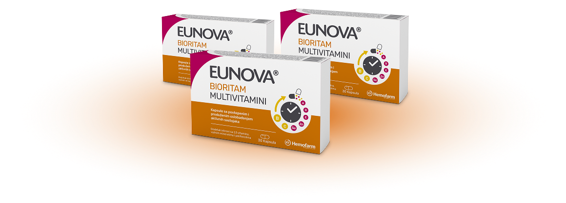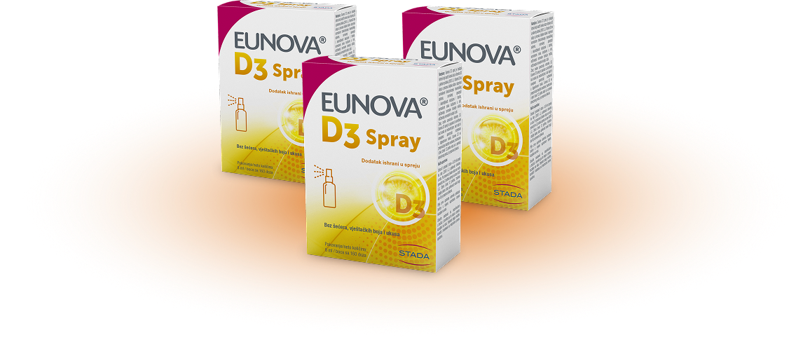 Proizvodi iz narandžaste linije: Eunova Bioritam Multivitamini, Eunova D3 sprej i Eunova DuoProtect D3+K2.